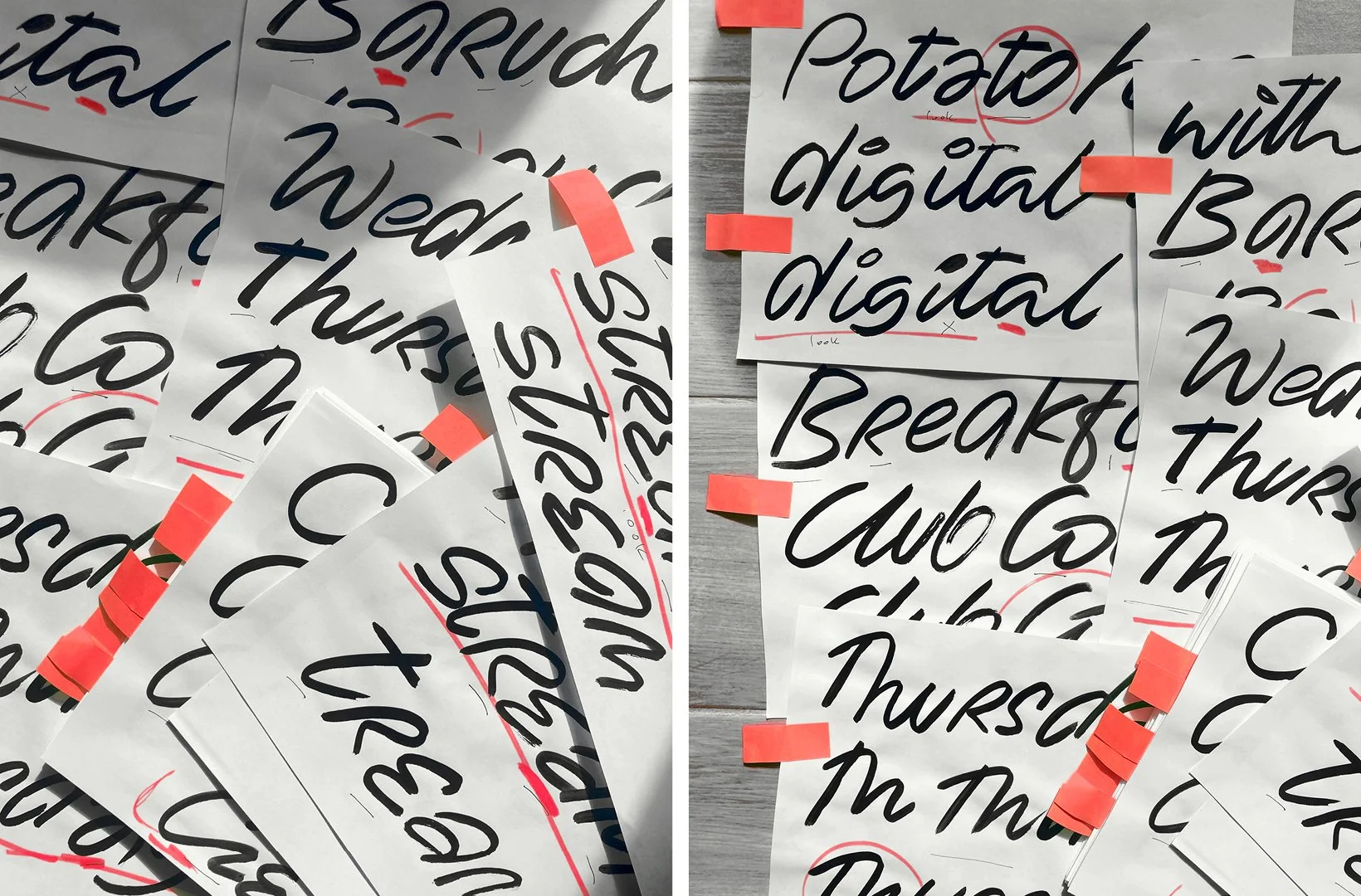 The pointed brush produced low-contrast, flowing letters, sometimes built with just one stroke. Joanna learned to go with the flow, allowing for spontaneous type design. She searched her past, delving into school notebooks to bring her natural handwritten quirks into the lettering. That DNA is still detectable where some lowercase letters resemble uppercase, and when uppercase letters also present as enlarged lowercase. All of this brings authenticity to a natural, easy-on-the-eye, and legible typeface.