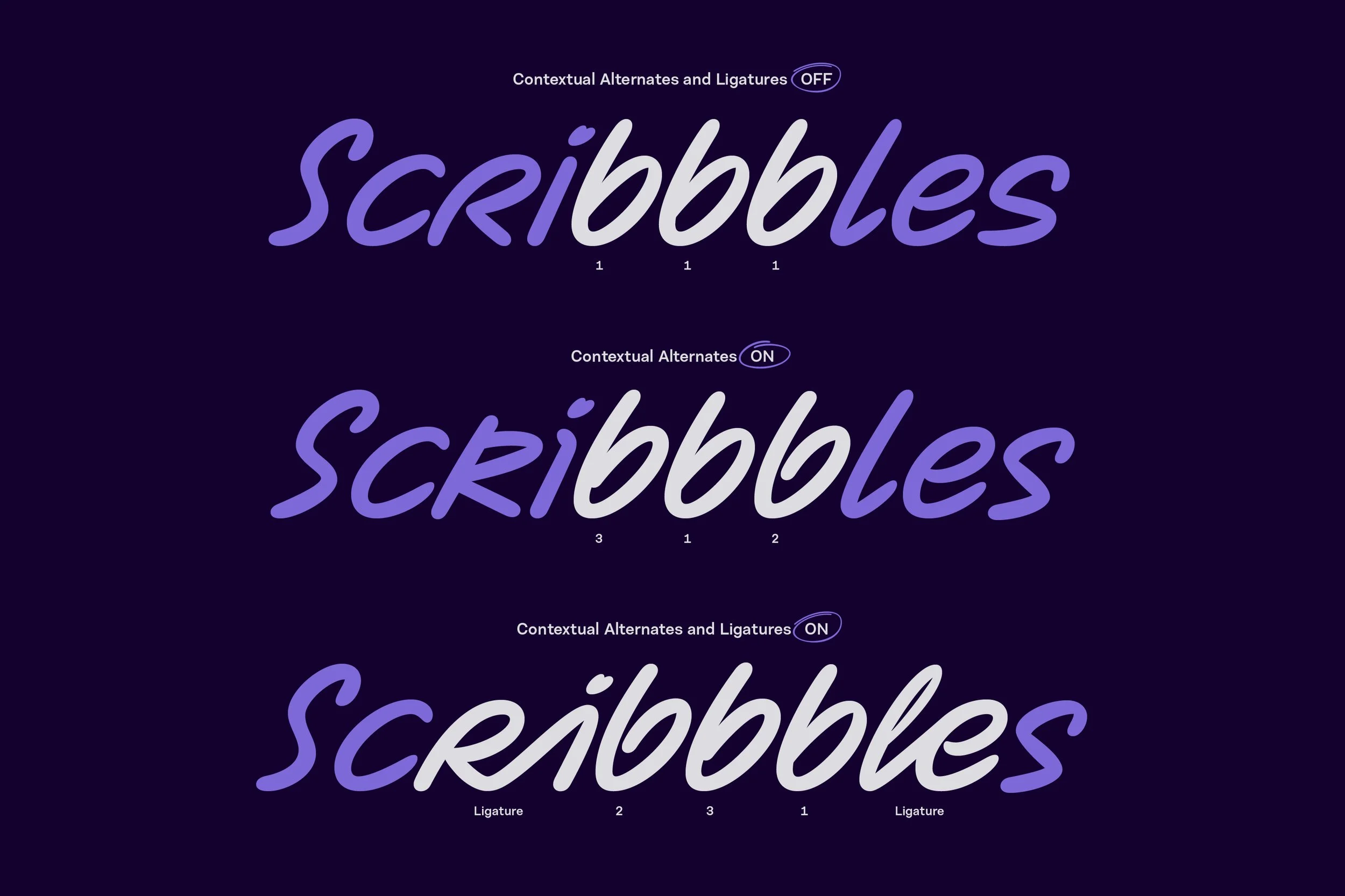 Echoing Joanna’s early analogue sketches, the font also supports contextual alternates. This feature automatically substitutes multiple occurrences of the same character, so no single shape is repeated in close proximity. By mimicking the variability and natural imperfections found in human handwriting, it offers you the chance to keep surprising your audience and keep things personal. Zabawa’s cleverly coded OpenType features prevent the typeface from appearing too rigid, and intentionally deliver the abstract nature of handwritten text.